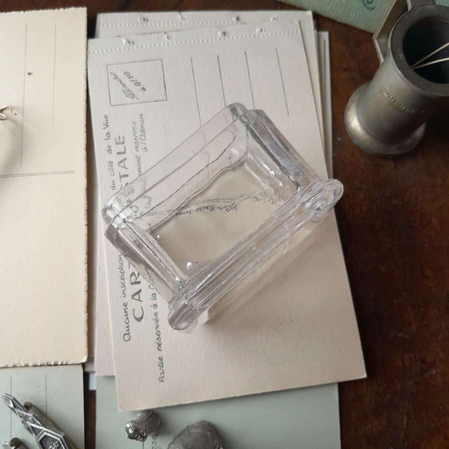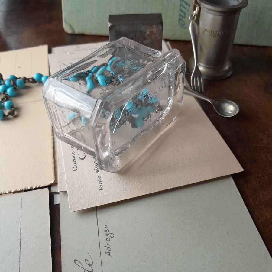 底の刻印にある住所で検索すると、1900年代初頭のゲランの商品に同じような刻印が認められるので、もしかするとこちらのブランドのものであったかもしれません。気泡が散らばっており、ややいびつな作りが古さを感じさせます。