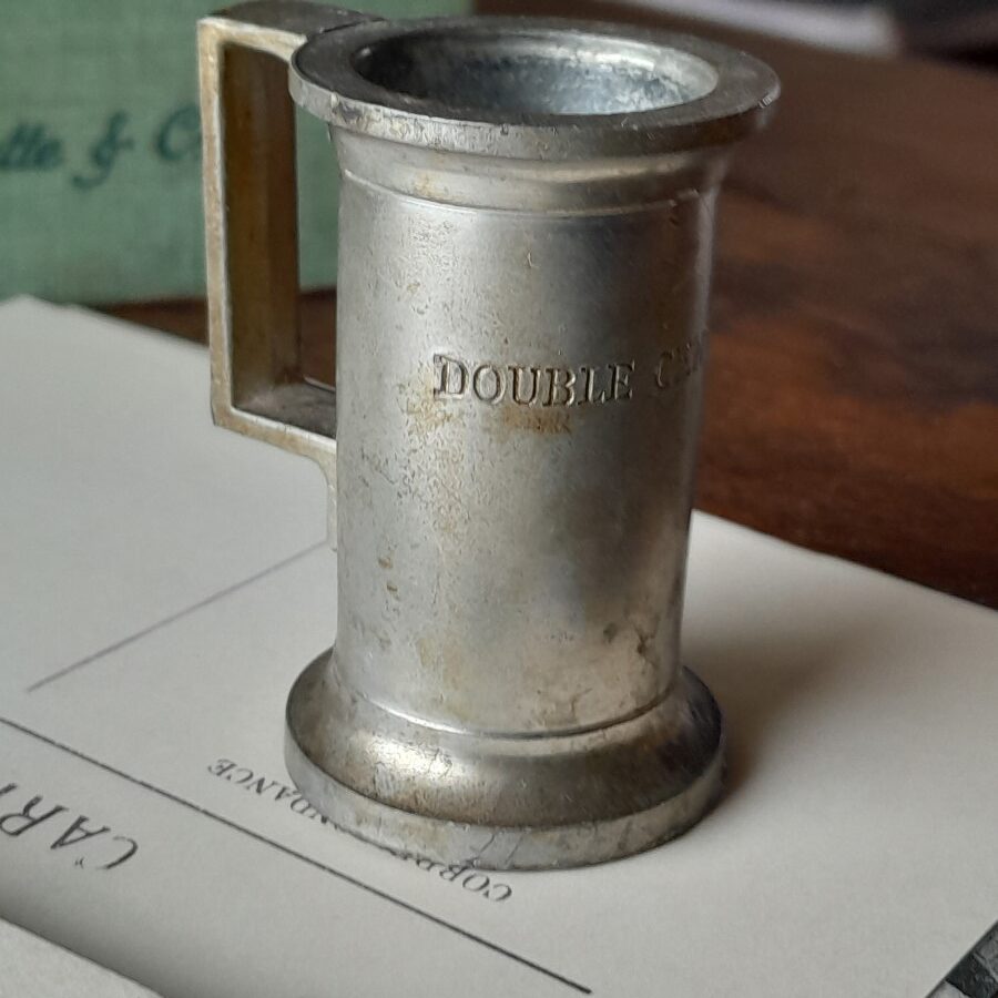 インテリアオブジェとしてフランスでは長く好まれてきた錫のポットには、色々なサイズがあります。こちらは一番小さいタイプのもので、ダブルセンチリットルという刻印が側面に入っています。